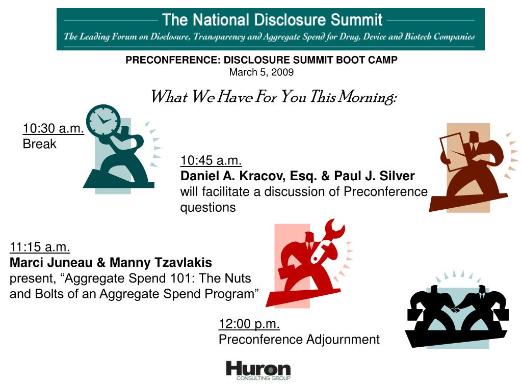 PRECONFERENCE: DISCLOSURE SUMMIT BOOT CAMP March 5, 2009 What We Have For You This Morning: 10:30 a.m. Break 10:45 a.m. Daniel A. Kracov, Esq. & Paul J. Silver will facilitate a discussion of Preconference questions 11:15 a.m. Marci Juneau & Manny Tzavlakispresent, “Aggregate Spend 101: The Nuts and Bolts of an Aggregate Spend Program” 12:00 p.m. Preconference Adjournment