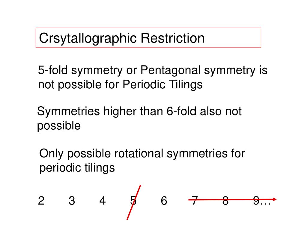Crsytallographic Restriction 5-fold symmetry or Pentagonal symmetry is not possible for Periodic Tilings Symmetries higher than 6-fold also not possible Only possible rotational symmetries for periodic tilings 2 3 4 5 6 7 8 9…