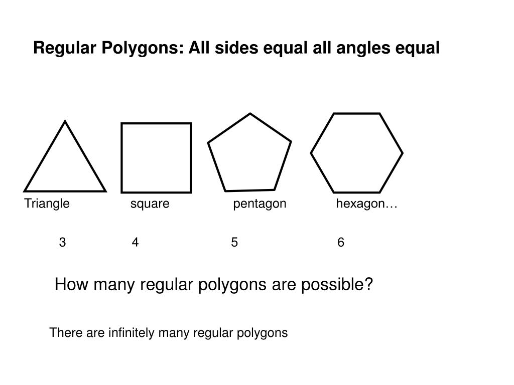 Regular Polygons: All sides equal all angles equal Triangle square pentagon hexagon… 3 4 5 6 How many regular polygons are possible? There are infinitely many regular polygons