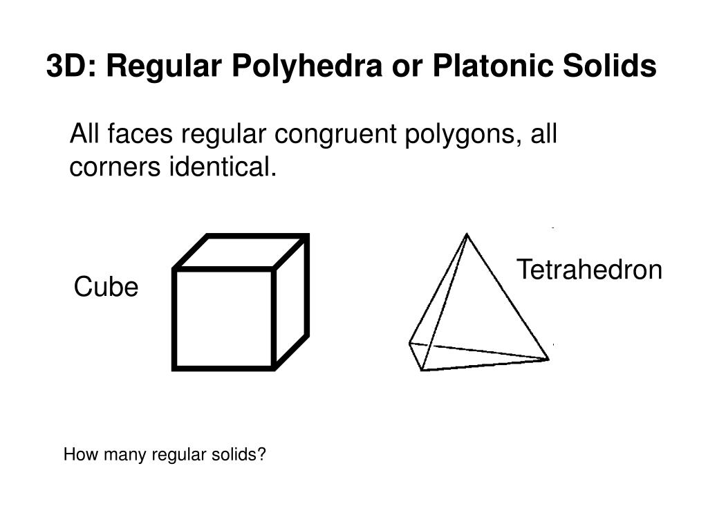 3D: Regular Polyhedra or Platonic Solids All faces regular congruent polygons, all corners identical. Tetrahedron Cube How many regular solids?