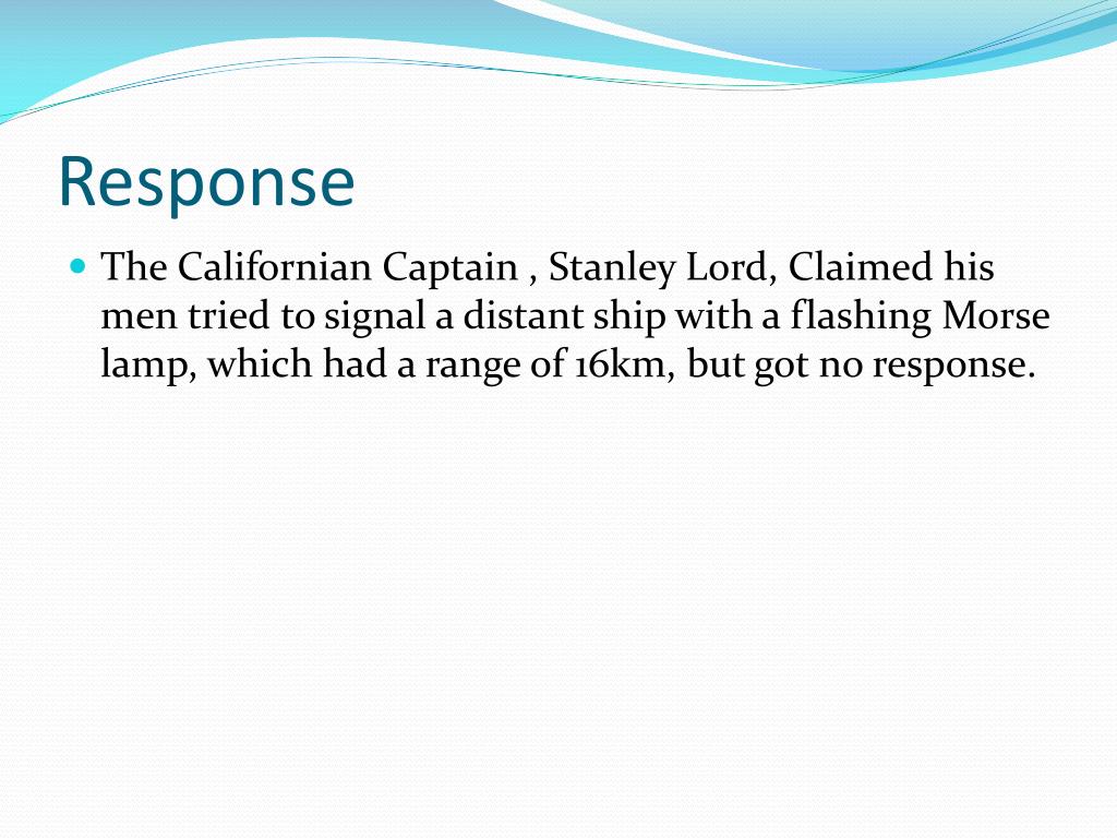 Response • The Californian Captain , Stanley Lord, Claimed his men tried to signal a distant ship with a flashing Morse lamp, which had a range of 16km, but got no response.