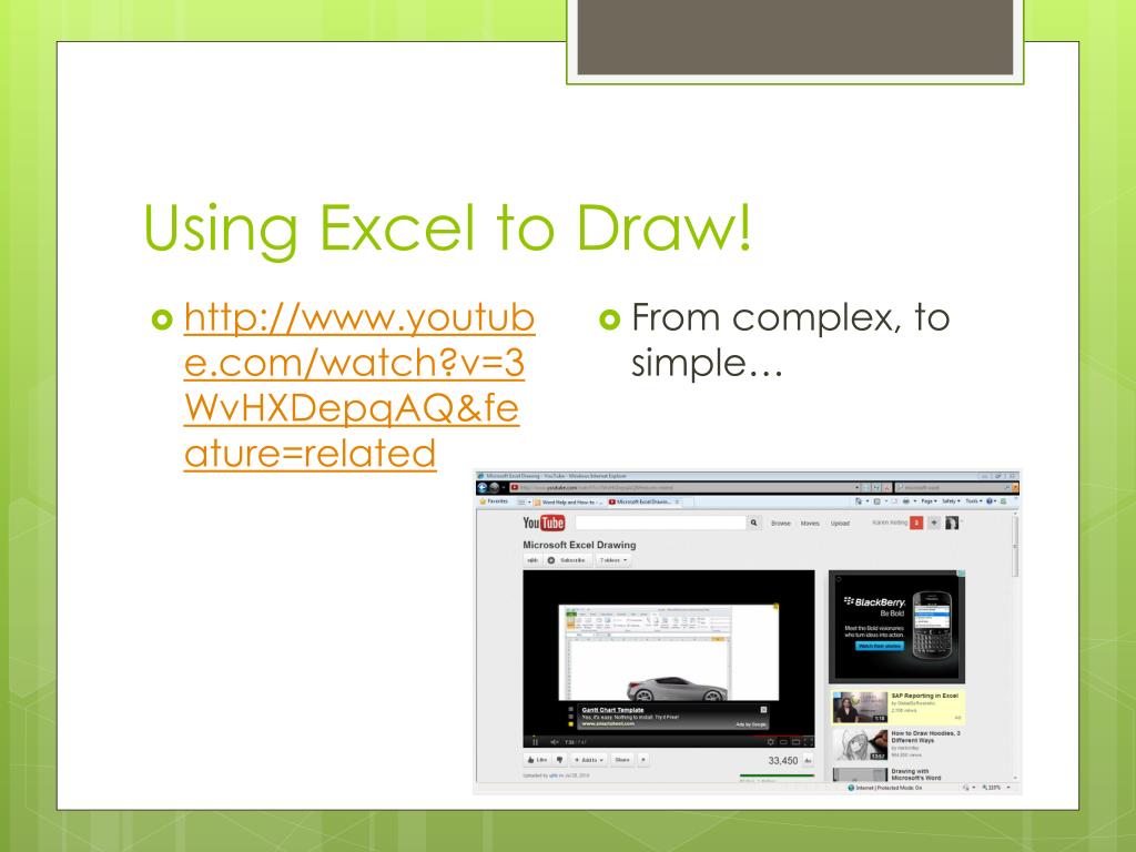 Using Excel to Draw! • http://www.youtube.com/watch?v=3WvHXDepqAQ&feature=related • From complex, to simple…