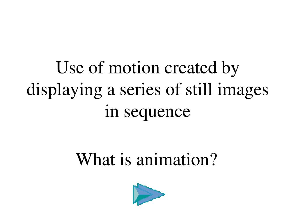 Use of motion created by displaying a series of still images in sequence What is animation?