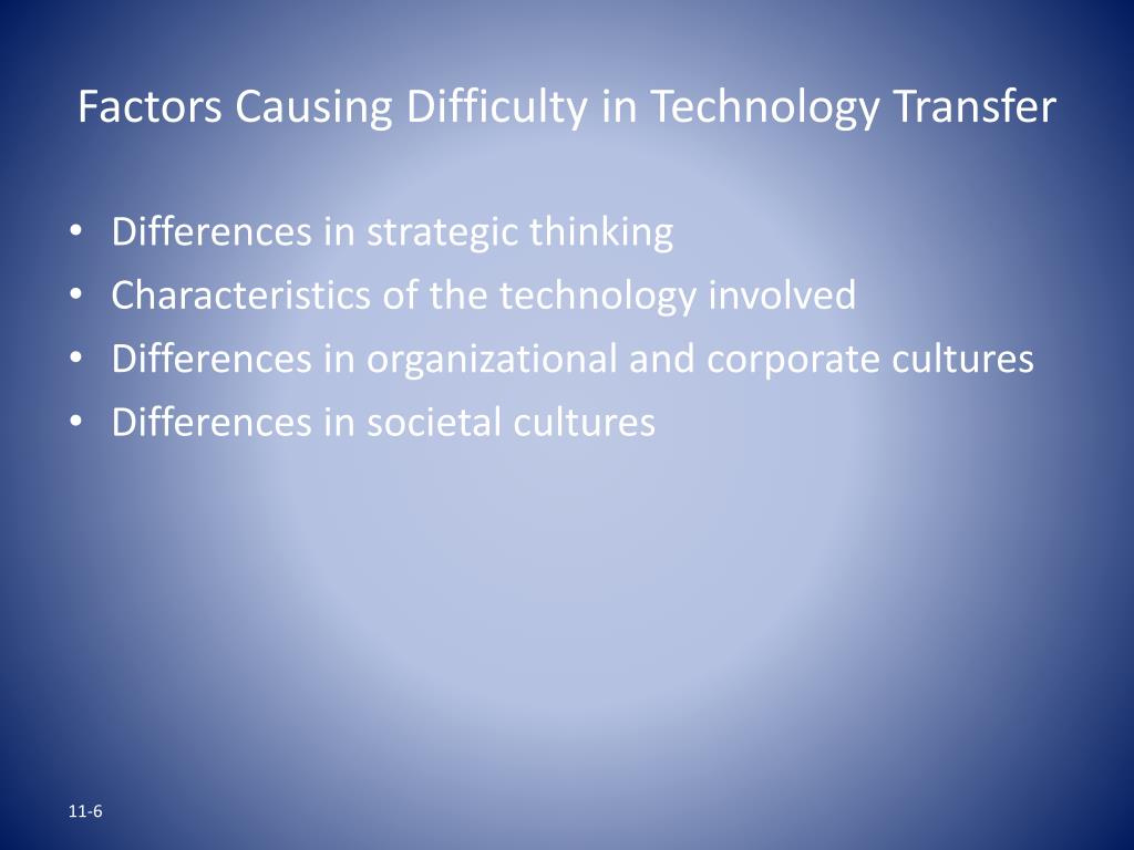 Factors Causing Difficulty in Technology Transfer • Differences in strategic thinking • Characteristics of the technology involved • Differences in organizational and corporate cultures • Differences in societal cultures