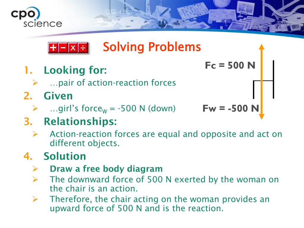 Solving Problems • A woman with a weight of 500 newtons is sitting on a chair. • Describe one action-reaction pair of forces in this situation.