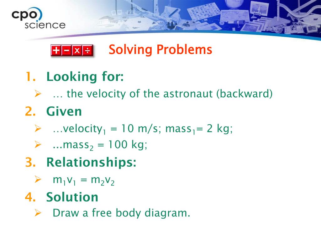 Solving Problems • If an astronaut in space were to release a 2-kilogram wrench at a speed of 10 m/s, the astronaut would move backward at what speed? • The astronaut’s mass is 100 kilograms.