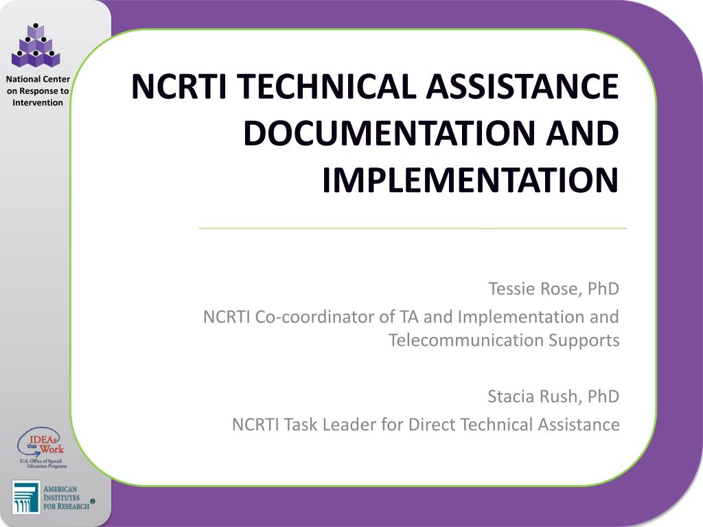 NCRTI Technical Assistance Documentation and Implementation Tessie Rose, PhD NCRTI Co-coordinator of TA and Implementation and Telecommunication Supports Stacia Rush, PhD NCRTI Task Leader for Direct Technical Assistance