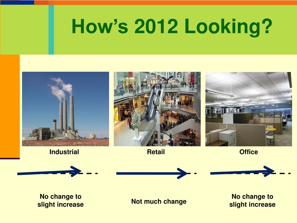 How’s 2012 Looking? Industrial Retail Office No change to slight increase No change to slight increase Not much change