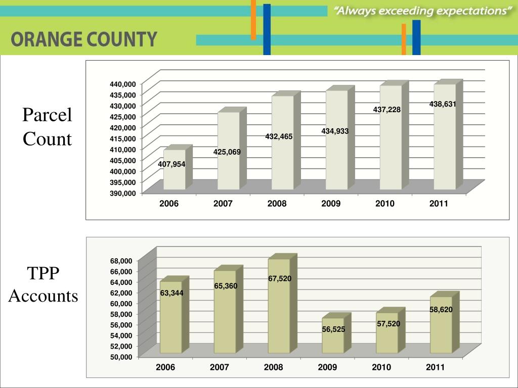 Orange County Valuation Trends. Honorable Bill Donegan, CFA. Orange County Property Appraiser. 17%. -0.5%. -10.6%. 21.8%. -12.6%. -2.5%. 12.4%. 8.0%. $81.5 B 2011 Prelim -2.4%. 6.1%. Parcel Count . TPP Accounts . New Construction Taxable Value. 3% for 2012. 2011 $1.5 B.