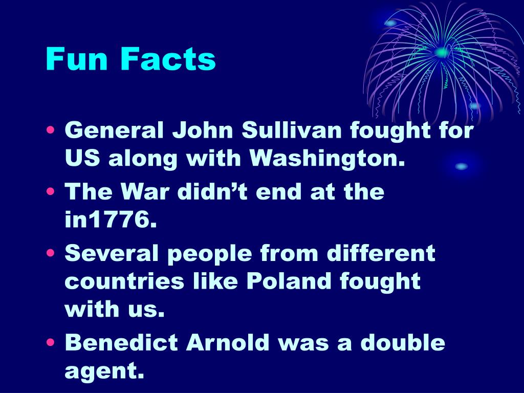 Fun Facts • General John Sullivan fought for US along with Washington. • The War didn’t end at the in1776. • Several people from different countries like Poland fought with us. • Benedict Arnold was a double agent.