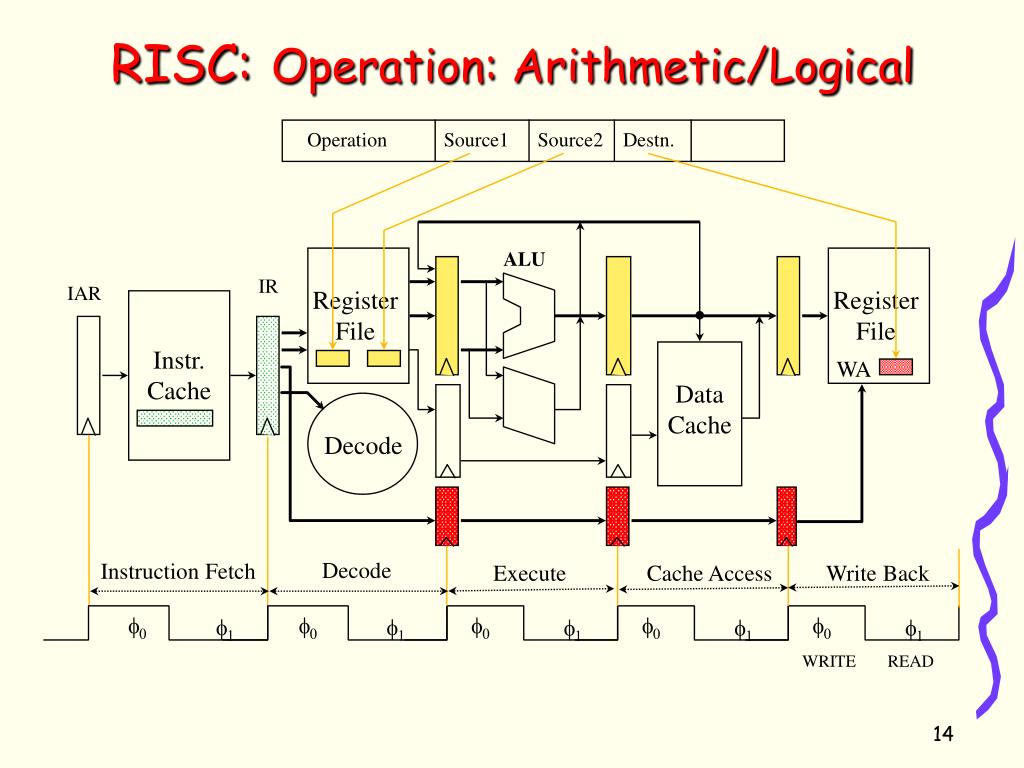 RISC:Operation: Arithmetic/Logical Register File f0 f0 f0 f0 f1 f1 f1 f1 Operation Source1 Source2 Destn. ALU IR IAR Register File Instr. Cache WA Data Cache Decode Decode Instruction Fetch Execute Cache Access Write Back f0 f1 WRITE READ