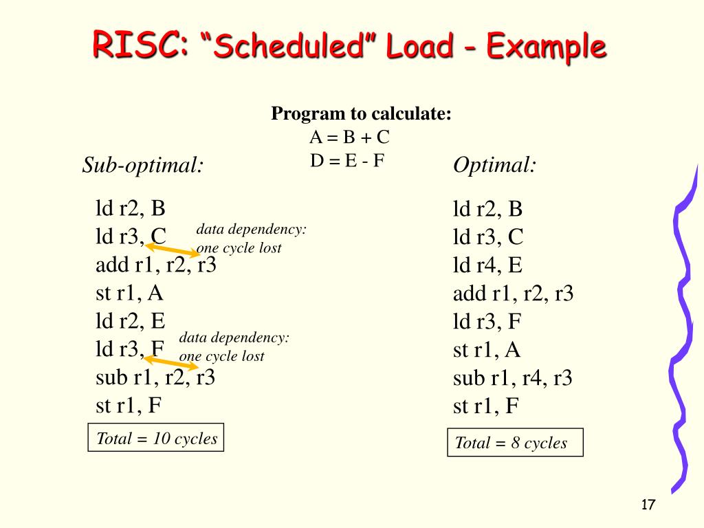 RISC: “Scheduled” Load - Example Program to calculate: A = B + C D = E - F Optimal: Sub-optimal: ld r2, B ld r3, C add r1, r2, r3 st r1, A ld r2, E ld r3, F sub r1, r2, r3 st r1, F ld r2, B ld r3, C ld r4, E add r1, r2, r3 ld r3, F st r1, A sub r1, r4, r3 st r1, F data dependency: one cycle lost data dependency: one cycle lost Total = 10 cycles Total = 8 cycles