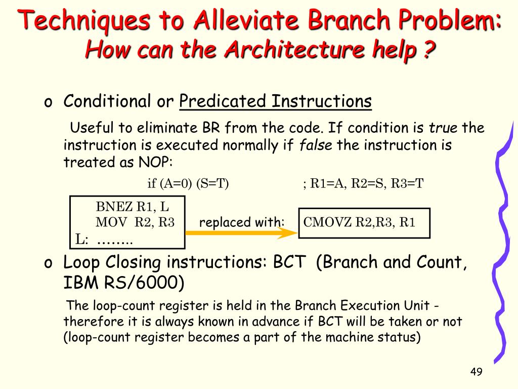 Techniques to Alleviate Branch Problem: How can the Architecture help ? • Conditional or Predicated Instructions Useful to eliminate BR from the code. If condition is true the instruction is executed normally if false the instruction is treated as NOP: if (A=0) (S=T) ; R1=A, R2=S, R3=T BNEZ R1, L MOV R2, R3 replaced with: CMOVZ R2,R3, R1 L: …….. • Loop Closing instructions: BCT (Branch and Count, IBM RS/6000) The loop-count register is held in the Branch Execution Unit - therefore it is always known in advance if BCT will be taken or not (loop-count register becomes a part of the machine status)