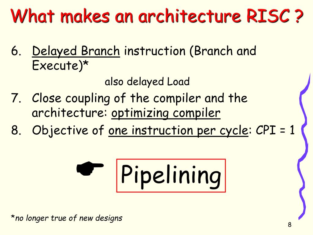 What makes an architecture RISC ? • Delayed Branch instruction (Branch and Execute)* also delayed Load • Close coupling of the compiler and the architecture: optimizing compiler • Objective of one instruction per cycle: CPI = 1 • Pipelining *no longer true of new designs
