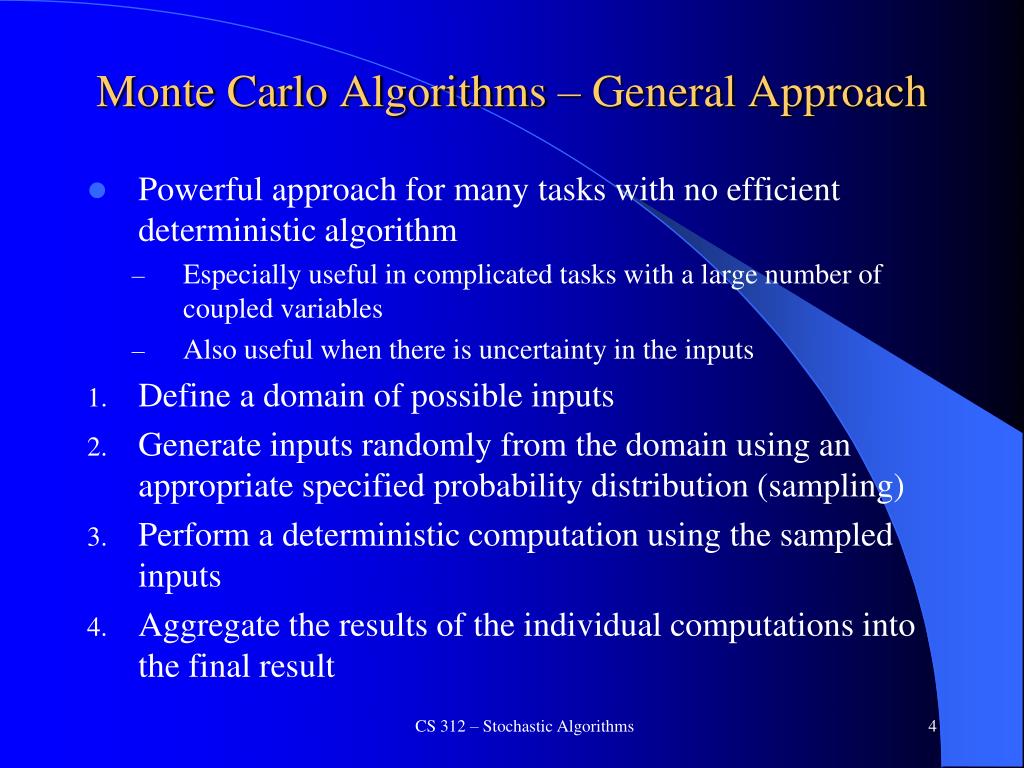 Monte Carlo Algorithms – General Approach • Powerful approach for many tasks with no efficient deterministic algorithm • Especially useful in complicated tasks with a large number of coupled variables • Also useful when there is uncertainty in the inputs • Define a domain of possible inputs • Generate inputs randomly from the domain using an appropriate specified probability distribution (sampling) • Perform a deterministic computation using the sampled inputs • Aggregate the results of the individual computations into the final result CS 312 – Stochastic Algorithms