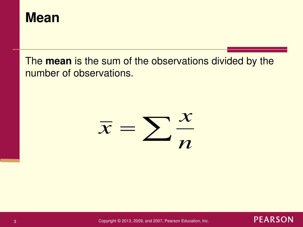 The mean is the sum of the observations divided by the number of observations. Mean