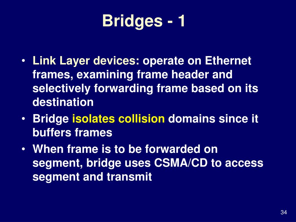 Bridges - 1 • Link Layer devices: operate on Ethernet frames, examining frame header and selectively forwarding frame based on its destination • Bridge isolates collision domains since it buffers frames • When frame is to be forwarded on segment, bridge uses CSMA/CD to access segment and transmit