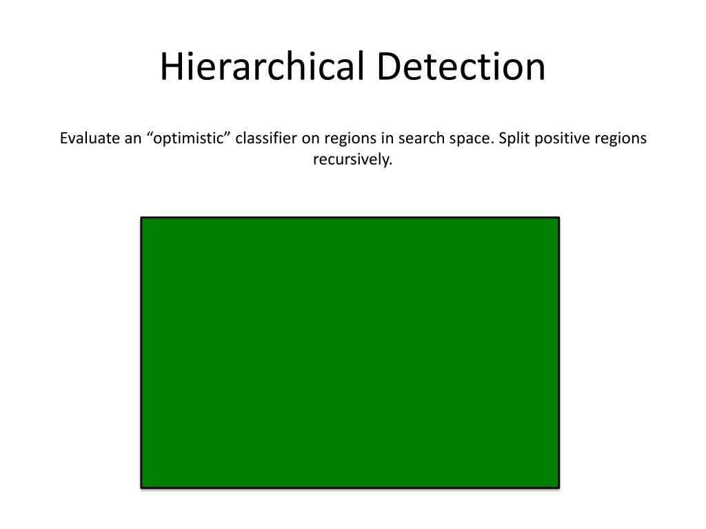Hierarchical Detection Evaluate an “optimistic” classifier on regions in search space. Split positive regions recursively.