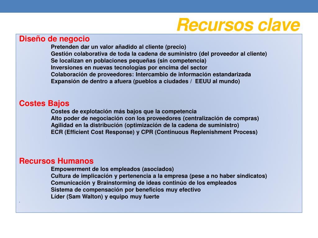 Recursos clave Diseño de negocio Pretenden dar un valor añadido al cliente (precio) Gestión colaborativa de toda la cadena de suministro (del proveedor al cliente) Se localizan en poblaciones pequeñas (sin competencia) Inversiones en nuevas tecnologías por encima del sector Colaboración de proveedores: Intercambio de información estandarizada Expansión de dentro a afuera (pueblos a ciudades / EEUU al mundo) Costes Bajos Costes de explotación más bajos que la competencia Alto poder de negociación con los proveedores (centralización de compras) Agilidad en la distribución (optimización de la cadena de suministro) ECR (Efficient Cost Response) y CPR (Continuous Replenishment Process) Recursos Humanos Empowerment de los empleados (asociados) Cultura de implicación y pertenencia a la empresa (pese a no haber sindicatos) Comunicación y Brainstorming de ideas continúo de los empleados Sistema de compensación por beneficios muy efectivo Líder (Sam Walton) y equipo muy fuerte