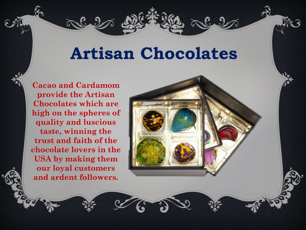 Artisan Chocolates Cacao and Cardamom provide the Artisan Chocolates which are high on the spheres of quality and luscious taste, winning the trust and faith of the chocolate lovers in the USA by making them our loyal customers and ardent followers.