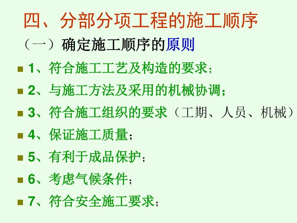 四、分部分项工程的施工顺序 (一)确定施工顺序的原则 • 1、符合施工工艺及构造的要求; • 2、与施工方法及采用的机械协调; • 3、符合施工组织的要求(工期、人员、机械) • 4、保证施工质量; • 5、有利于成品保护; • 6、考虑气候条件; • 7、符合安全施工要求;
