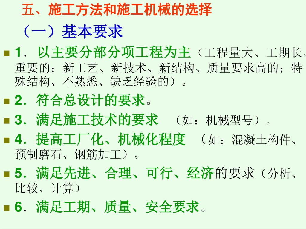 五、施工方法和施工机械的选择 (一)基本要求 • 1.以主要分部分项工程为主(工程量大、工期长、重要的;新工艺、新技术、新结构、质量要求高的;特殊结构、不熟悉、缺乏经验的)。 • 2.符合总设计的要求。 • 3.满足施工技术的要求 (如:机械型号)。 • 4.提高工厂化、机械化程度 (如:混凝土构件、预制磨石、钢筋加工)。 • 5.满足先进、合理、可行、经济的要求(分析、比较、计算) • 6.满足工期、质量、安全要求。