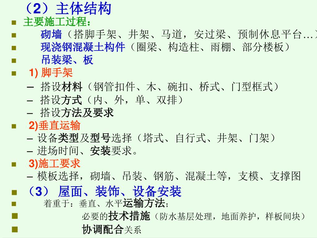 (2)主体结构 • 主要施工过程: • 砌墙(搭脚手架、井架、马道,安过梁、预制休息平台…) • 现浇钢混凝土构件(圈梁、构造柱、雨棚、部分楼板) • 吊装梁、板 • 1) 脚手架 • 搭设材料(钢管扣件、木、碗扣、桥式、门型框式) • 搭设方式(内、外,单、双排) • 搭设方法及要求 • 2)垂直运输 • 设备类型及型号选择(塔式、自行式、井架、门架) • 进场时间、安装要求。 • 3)施工要求 • 模板选择,砌墙、吊装、钢筋、混凝土等,支模、支撑图 • (3) 屋面、装饰、设备安装 • 着重于:垂直、水平运输方法; • 必要的技术措施(防水基层处理,地面养护,样板间块) • 协调配合关系