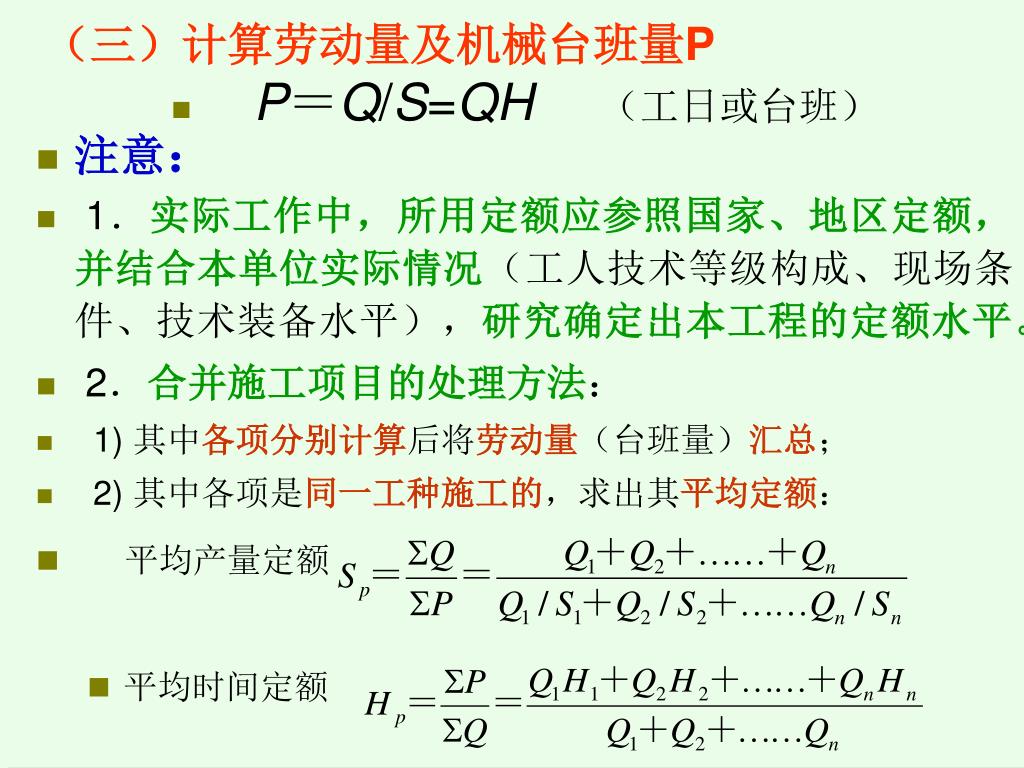 (三)计算劳动量及机械台班量P • P=Q/S=QH(工日或台班) • 注意: • 1.实际工作中,所用定额应参照国家、地区定额,并结合本单位实际情况(工人技术等级构成、现场条件、技术装备水平),研究确定出本工程的定额水平。 • 2.合并施工项目的处理方法: • 1) 其中各项分别计算后将劳动量(台班量)汇总; • 2) 其中各项是同一工种施工的,求出其平均定额: • 平均产量定额 • 平均时间定额
