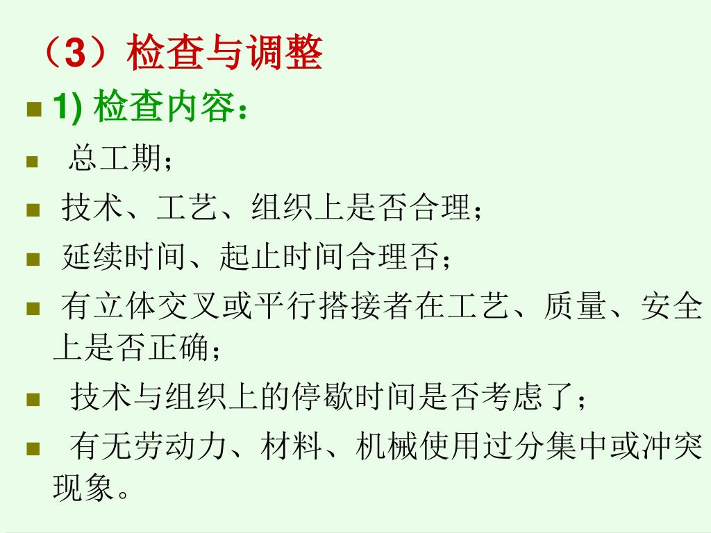 (3)检查与调整 • 1) 检查内容: • 总工期; • 技术、工艺、组织上是否合理; • 延续时间、起止时间合理否; • 有立体交叉或平行搭接者在工艺、质量、安全上是否正确; • 技术与组织上的停歇时间是否考虑了; • 有无劳动力、材料、机械使用过分集中或冲突现象。
