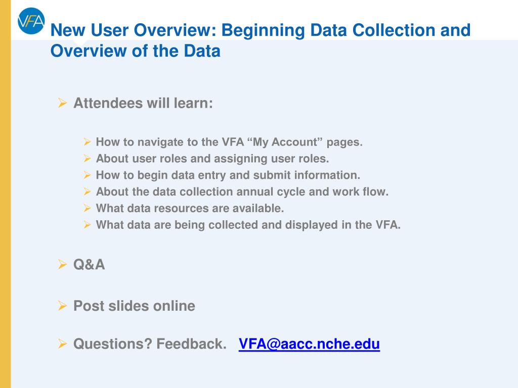 New User Overview: Beginning Data Collection and Overview of the Data • Attendees will learn: • How to navigate to the VFA “My Account” pages. • About user roles and assigning user roles. • How to begin data entry and submit information. • About the data collection annual cycle and work flow. • What data resources are available. • What data are being collected and displayed in the VFA. • Q&A • Post slides online • Questions? Feedback. VFA@aacc.nche.edu