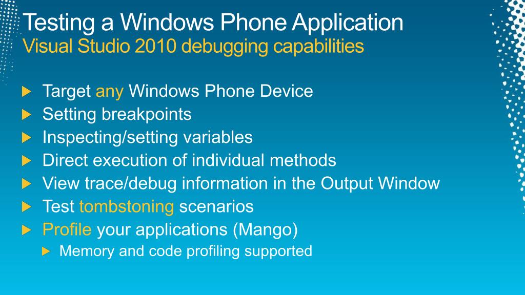 Testing a Windows Phone ApplicationVisual Studio 2010 debugging capabilities • Target any Windows Phone Device • Setting breakpoints • Inspecting/setting variables • Direct execution of individual methods • View trace/debug information in the Output Window • Test tombstoning scenarios • Profile your applications (Mango) • Memory and code profiling supported