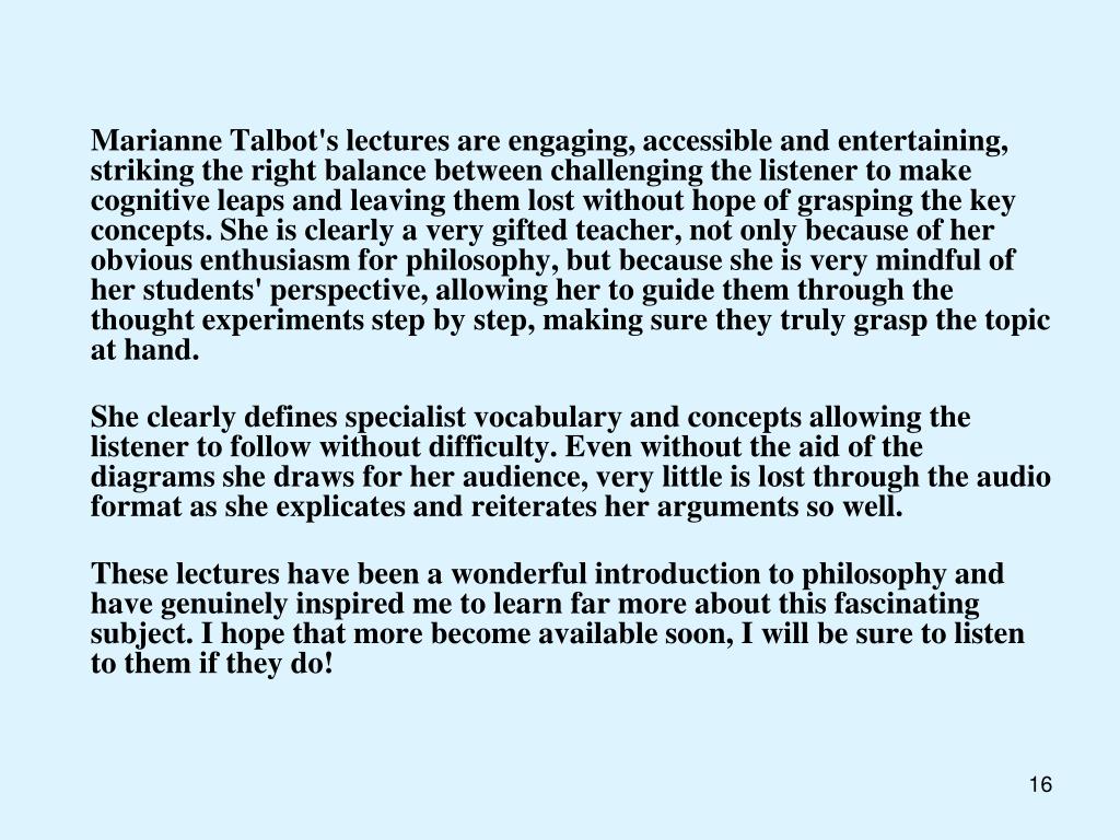 Marianne Talbot's lectures are engaging, accessible and entertaining, striking the right balance between challenging the listener to make cognitive leaps and leaving them lost without hope of grasping the key concepts. She is clearly a very gifted teacher, not only because of her obvious enthusiasm for philosophy, but because she is very mindful of her students' perspective, allowing her to guide them through the thought experiments step by step, making sure they truly grasp the topic at hand. She clearly defines specialist vocabulary and concepts allowing the listener to follow without difficulty. Even without the aid of the diagrams she draws for her audience, very little is lost through the audio format as she explicates and reiterates her arguments so well. These lectures have been a wonderful introduction to philosophy and have genuinely inspired me to learn far more about this fascinating subject. I hope that more become available soon, I will be sure to listen to them if they do!