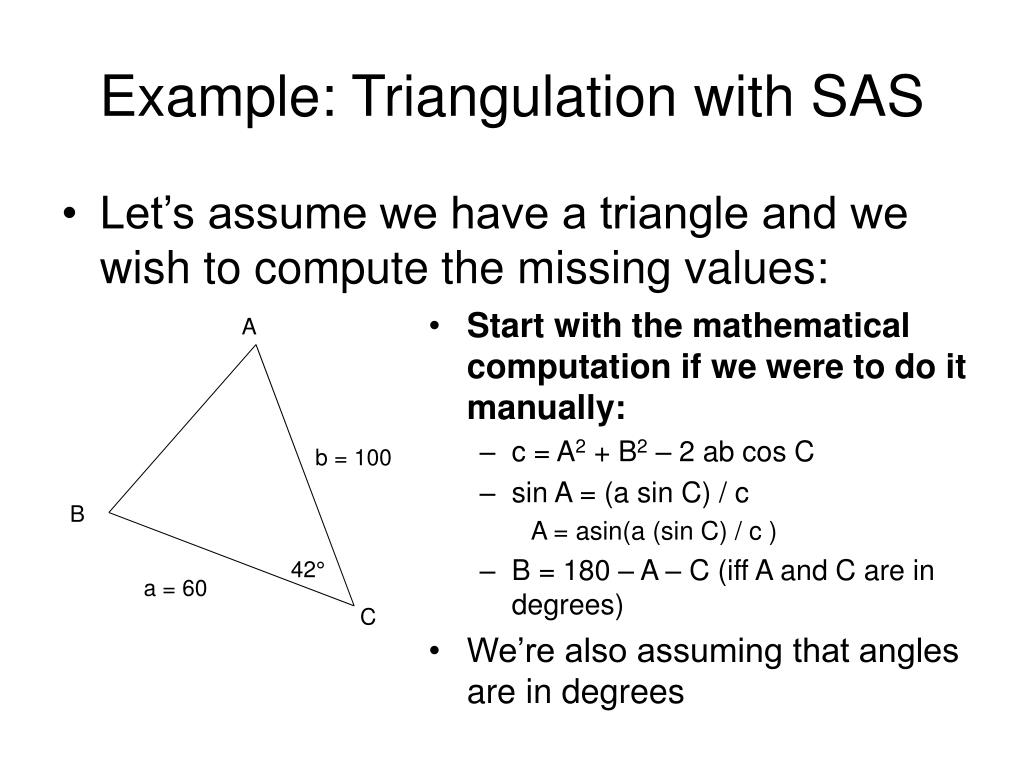 A b = 100 B 42° a = 60 C Example: Triangulation with SAS • Let’s assume we have a triangle and we wish to compute the missing values: • Start with the mathematical computation if we were to do it manually: • c = A2 + B2 – 2 ab cos C • sin A = (a sin C) / c A = asin(a (sin C) / c ) • B = 180 – A – C (iff A and C are in degrees) • We’re also assuming that angles are in degrees