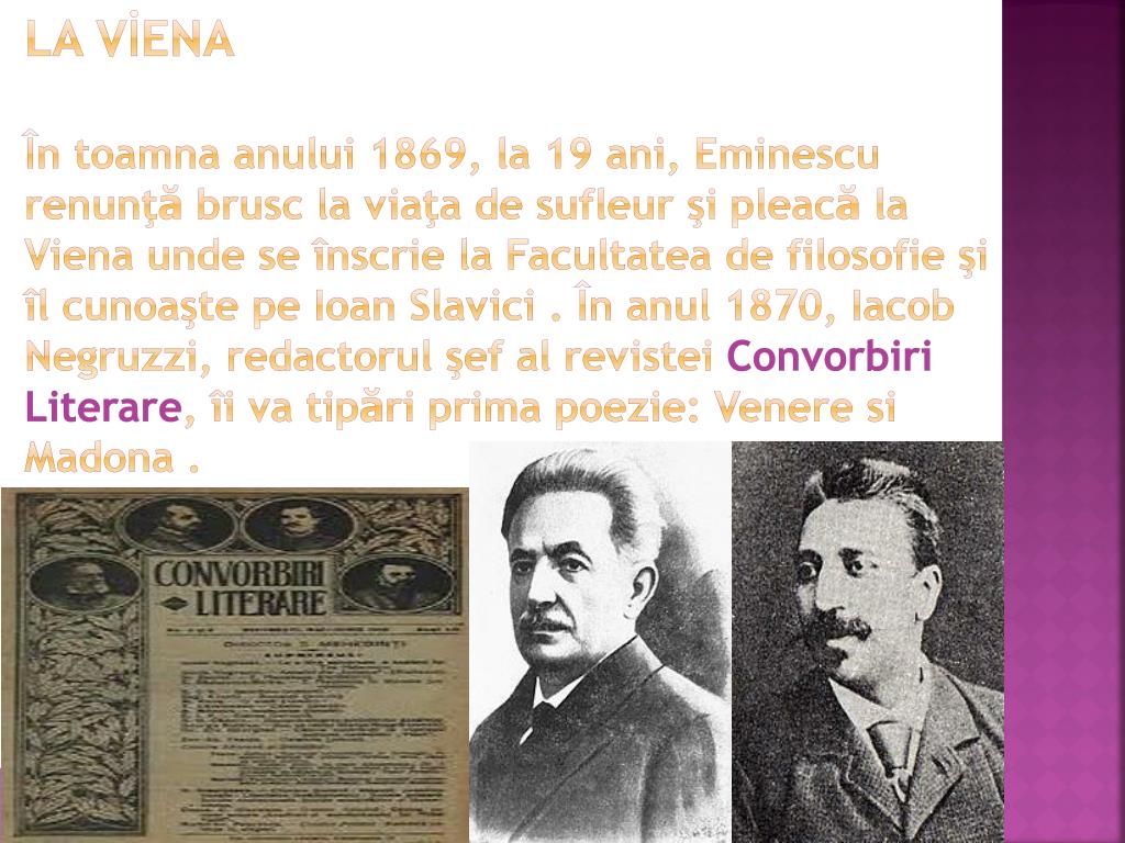 LA VİENAÎntoamnaanului 1869, la 19 ani, Eminescurenunţăbrusc la viaţa de sufleurşipleacă la Vienaunde se înscrie la Facultatea de filosofieşiîlcunoaştepeIoanSlavici . Înanul 1870, IacobNegruzzi, redactorulşef al revisteiConvorbiriLiterare, îiva tipări prima poezie: VeneresiMadona .