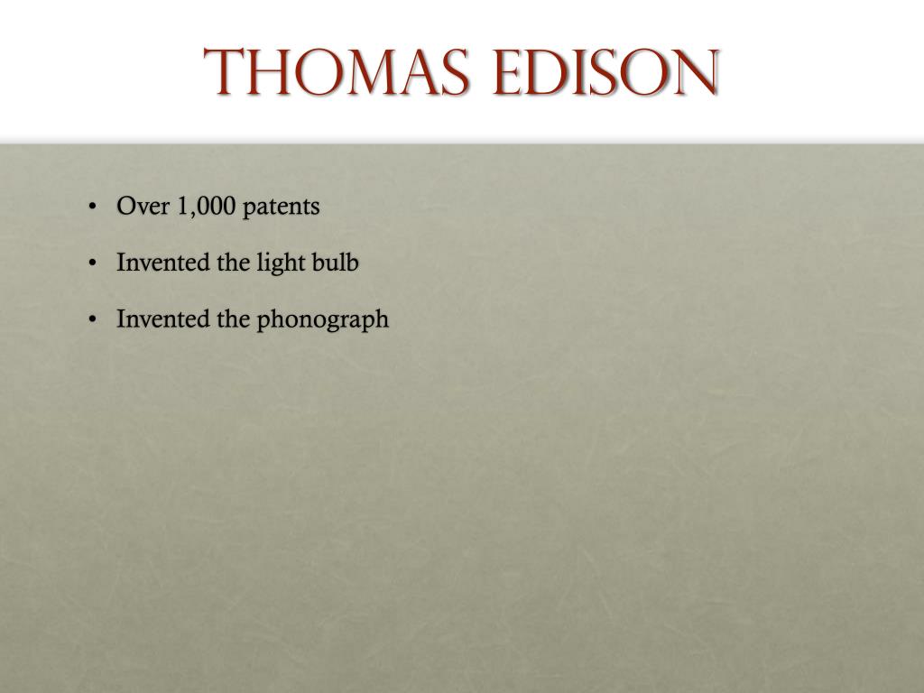 Thomas Edison • Over 1,000 patents • Invented the light bulb • Invented the phonograph
