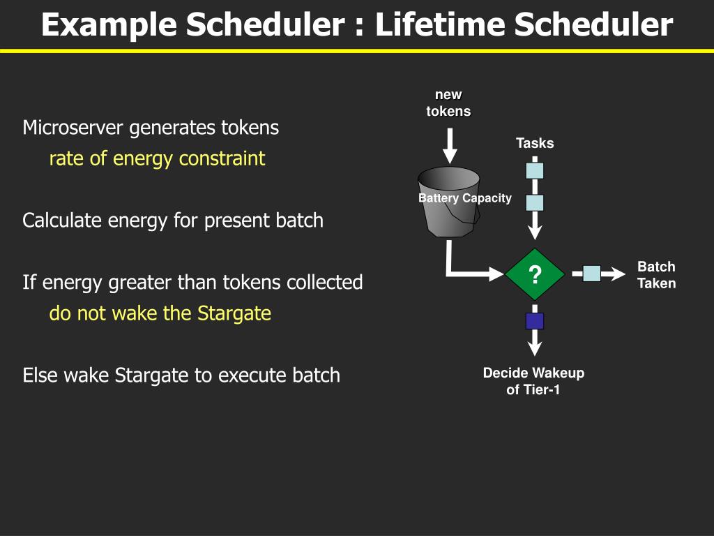 Example Scheduler : Lifetime Scheduler new tokens ? Tasks Battery Capacity Batch Taken Decide Wakeup of Tier-1 • Microserver generates tokens • rate of energy constraint • Calculate energy for present batch • If energy greater than tokens collected • do not wake the Stargate • Else wake Stargate to execute batch