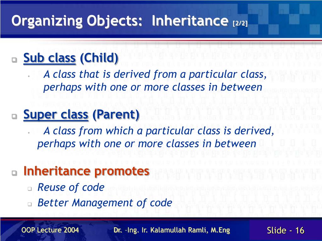Organizing Objects: Inheritance [2/2] • Sub class (Child) • A class that is derived from a particular class, perhaps with one or more classes in between • Super class (Parent) • A class from which a particular class is derived, perhaps with one or more classes in between • Inheritance promotes • Reuse of code • Better Management of code