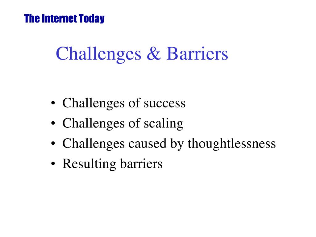 The Internet Today Challenges & Barriers • Challenges of success • Challenges of scaling • Challenges caused by thoughtlessness • Resulting barriers