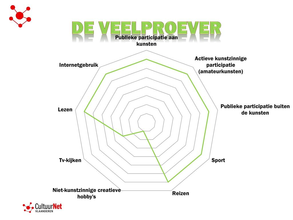 De veelproever • Cultureel gedrag • Brede smaak, populair en artistiek: interesse in pop/rock en klassieke muziek, tentoonstellingen, theater en festivals, blockbuster- en arthouse films in de cinema (niet thuis) • Doet alles tegelijk: cultuur, sport, reizen, lezen, café, restaurant, shoppen, wandelen, uitgaan… • Reizen: cultuur of avontuur, niet voor rust • Vaak actief met amateurkunst: muziek, beeldende kunst, toneel • Vaak lid van een of meer verenigingen: amateurkunst, sport, jeugd, natuur, derde wereld… • Interesse in andere (eet)culturen • Excuus voor niet-deelname: amper van toepassing, tenzij te veel om uit te kiezen