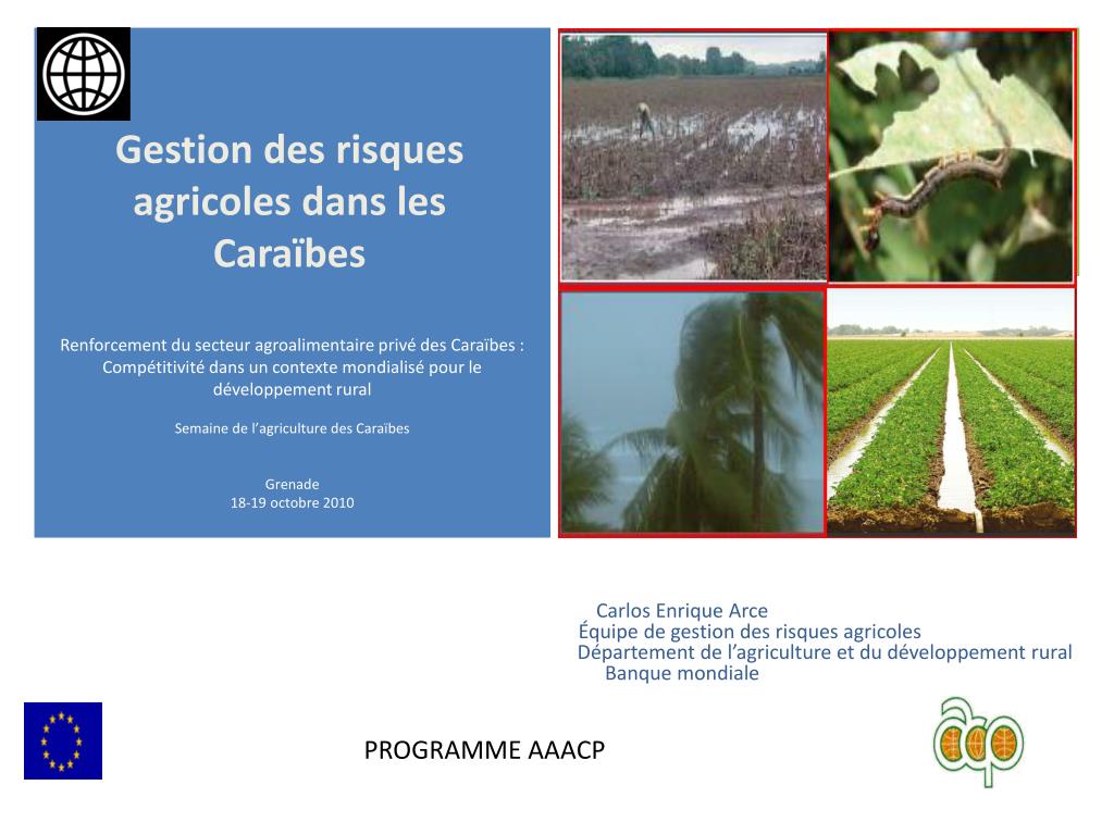 Gestion des risques agricoles dans les Caraïbes Carlos Enrique Arce Équipe de gestion des risques agricoles Département de l’agriculture et du développement ruralBanque mondiale Renforcement du secteur agroalimentaire privé des Caraïbes : Compétitivité dans un contexte mondialisé pour le développement rural Semaine de l’agriculture des Caraïbes Grenade 18-19 octobre 2010 PROGRAMME AAACP