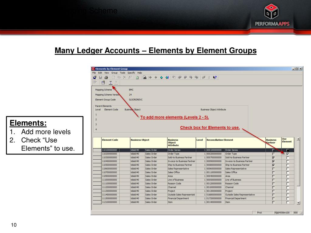 Many Ledger Accounts – Elements by Element Groups Elements: Add more levels Check “Use Elements” to use. Integrations – Mapping SchemeMain Session