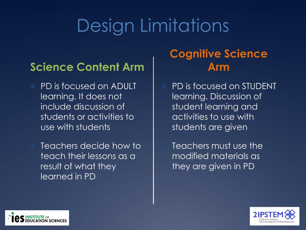 Design Limitations Cognitive Science Arm PD is focused on STUDENT learning. Discussion of student learning and activities to use with students are given Teachers must use the modified materials as they are given in PD Science Content Arm • PD is focused on ADULT learning. It does not include discussion of students or activities to use with students • Teachers decide how to teach their lessons as a result of what they learned in PD