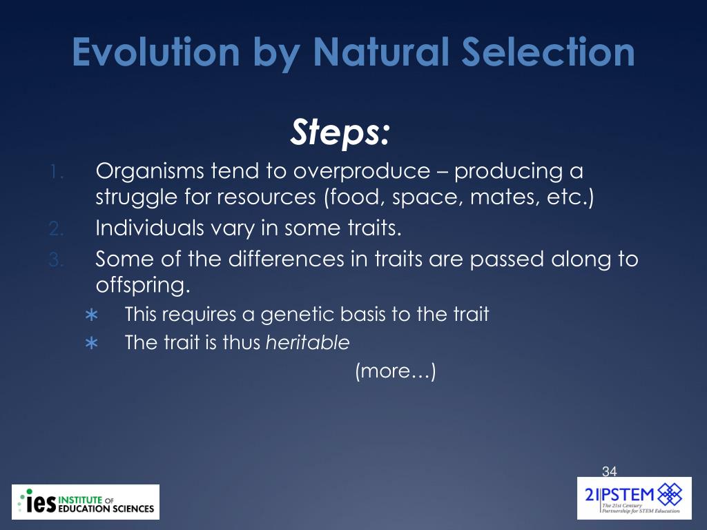 Evolution by Natural Selection Steps: Organisms tend to overproduce – producing a struggle for resources (food, space, mates, etc.) Individuals vary in some traits. Some of the differences in traits are passed along to offspring. This requires a genetic basis to the trait The trait is thus heritable (more…)