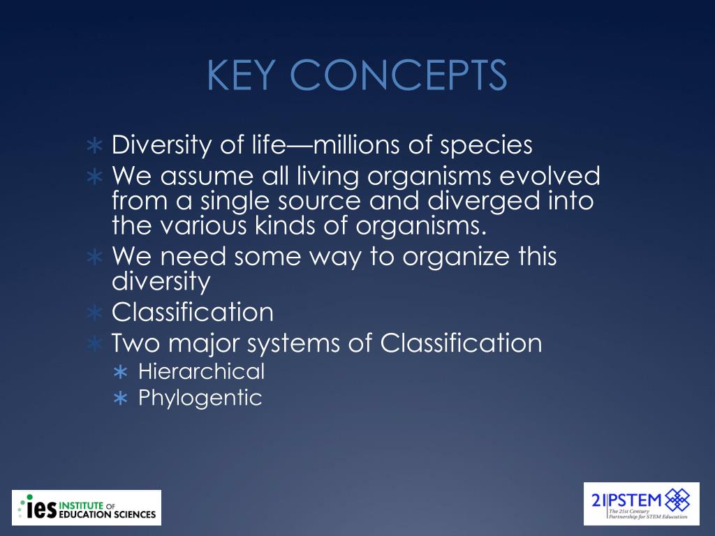 KEY CONCEPTS • Diversity of life—millions of species • We assume all living organisms evolved from a single source and diverged into the various kinds of organisms. • We need some way to organize this diversity • Classification • Two major systems of Classification • Hierarchical • Phylogentic
