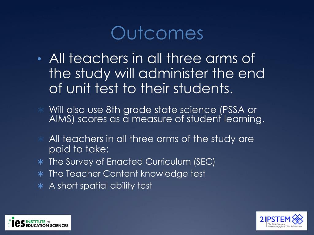 Outcomes • All teachers in all three arms of the study will administer the end of unit test to their students. • Will also use 8th grade state science (PSSA or AIMS) scores as a measure of student learning. • All teachers in all three arms of the study are paid to take: • The Survey of Enacted Curriculum (SEC) • The Teacher Content knowledge test • A short spatial ability test