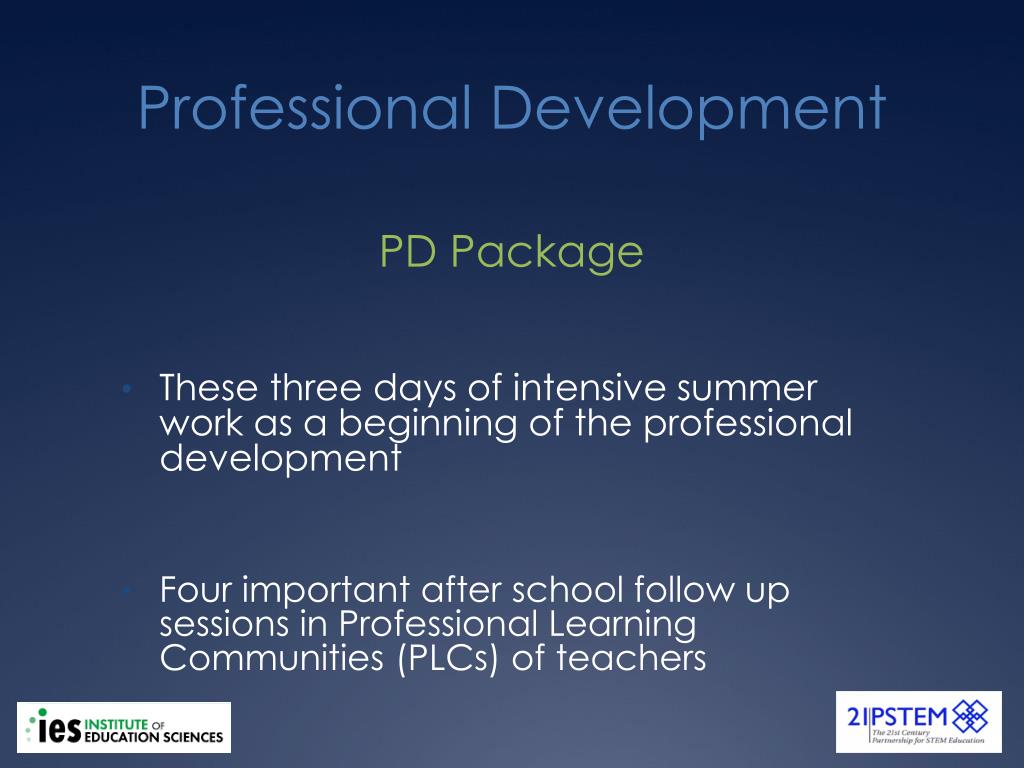 Professional Development PD Package • These three days of intensive summer work as a beginning of the professional development • Four important after school follow up sessions in Professional Learning Communities (PLCs) of teachers