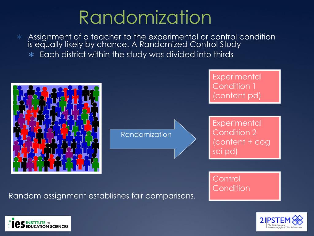 Randomization Experimental Condition 1 (content pd) • Assignment of a teacher to the experimental or control condition is equally likely by chance. A Randomized Control Study • Each district within the study was divided into thirds Experimental Condition 2 (content + cog sci pd) Randomization Control Condition Random assignment establishes fair comparisons.