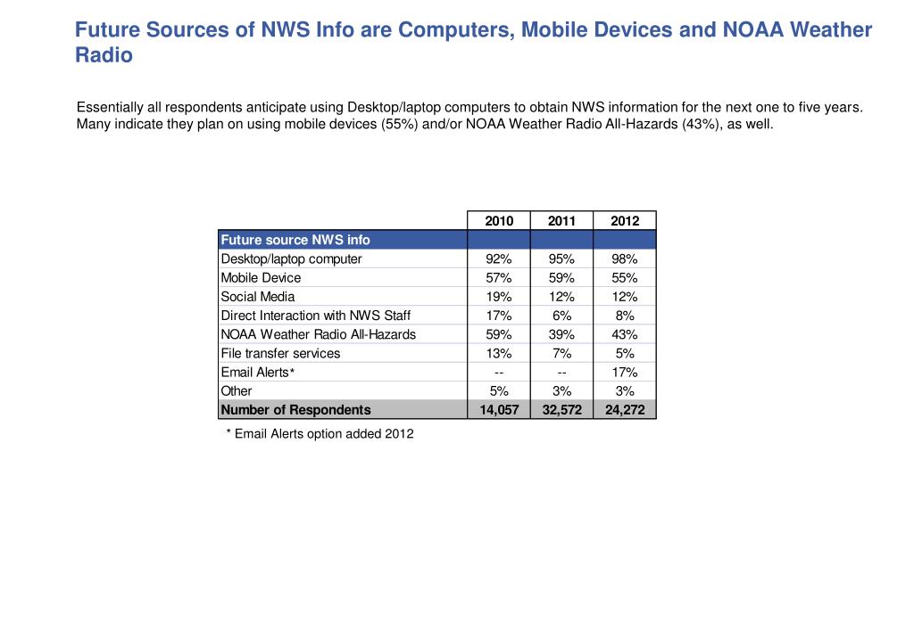 Future Sources of NWS Info are Computers, Mobile Devices and NOAA Weather Radio Essentially all respondents anticipate using Desktop/laptop computers to obtain NWS information for the next one to five years. Many indicate they plan on using mobile devices (55%) and/or NOAA Weather Radio All-Hazards (43%), as well. * * Email Alerts option added 2012