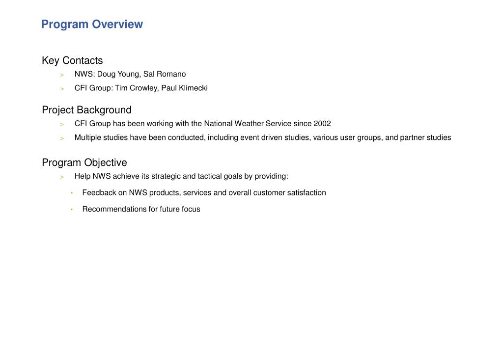 Program Overview Key Contacts • NWS: Doug Young, Sal Romano • CFI Group: Tim Crowley, Paul Klimecki Project Background • CFI Group has been working with the National Weather Service since 2002 • Multiple studies have been conducted, including event driven studies, various user groups, and partner studies Program Objective • Help NWS achieve its strategic and tactical goals by providing: • Feedback on NWS products, services and overall customer satisfaction • Recommendations for future focus