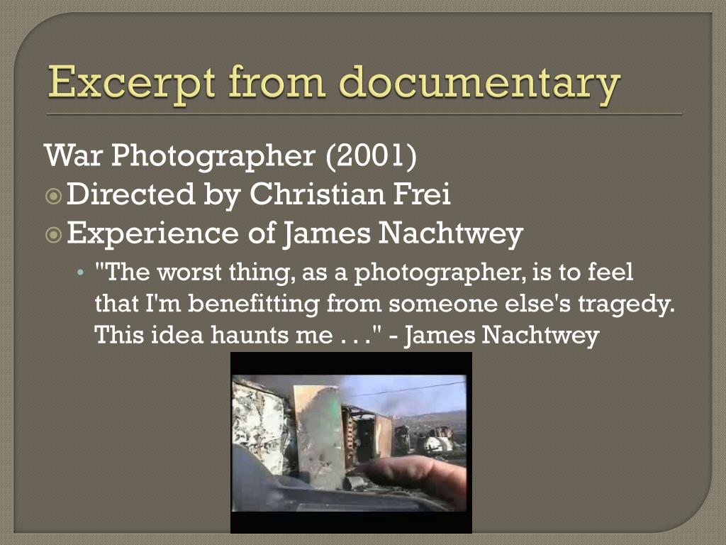 Excerpt from documentary War Photographer (2001) • Directed by Christian Frei • Experience of James Nachtwey • "The worst thing, as a photographer, is to feel that I'm benefitting from someone else's tragedy. This idea haunts me . . ." - James Nachtwey